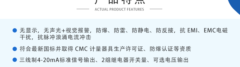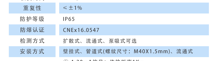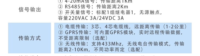 ①4-20mA信號:傳輸距離1Km ②RS485信號:傳輸距離2Km |