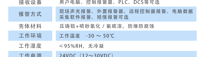 現(xiàn)場聲光報警、外置報警器、遠程控制器報警、電腦數(shù)據(jù)采集軟件報警、短信報警可選 |