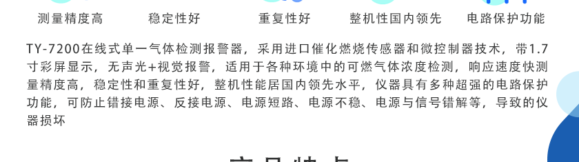 采用進口催化燃燒傳感器和微控制器技術,帶2.5寸高清彩屏實時顯示,無聲光+視覺報警,現場多種氣體濃度 24 小時連續(xù)在線監(jiān)測及溫濕度的測量,適用于各種環(huán)境中的可燃氣體濃度檢測,響應速度快,測量精度高,穩(wěn)定性和重復性好,整機性能居國內領先水平。儀器具有多種超強的電路保護功能,可防止錯接電源、反接電源、電源短路、電源不穩(wěn)、電源與信號錯解等,導致的儀器損壞。