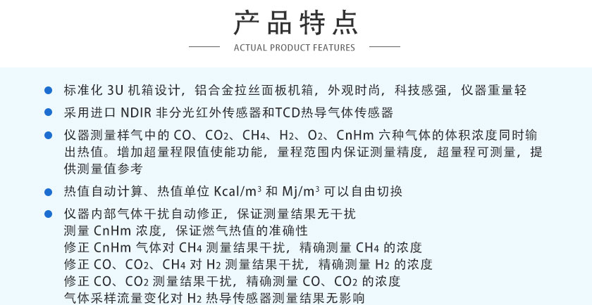 (3)儀器測量樣氣中的CO、CO2、CH4、H2、O2、CnHm六種氣體的體積濃度同時輸出熱值。增加超量程限值使能功能,量程范圍內保證測量精度,超量程可測量,提供測量值參考