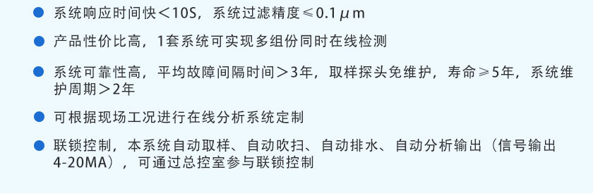 TY-8300型煤氣在線分析系統是天禹智控自主研發(fā)新型在線監(jiān)測系統,該產品基于非分光紅外(NDIR)氣體分析技術、長壽命電化學傳感技術以及基于MEMS的熱導技術,可同時在線測量煤氣的熱值,以及CO、CO2、CH4、H2、O2、CnHm等氣體的體積濃度。預處理系統采用冷干法設計,關鍵部件采用原裝進口,可根據現場不同的工況條件,為客戶定制解決方案,保證分析系統的可靠運行。