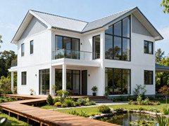 外墻采用水泥纖維掛板,屋頂采用瀝青瓦
